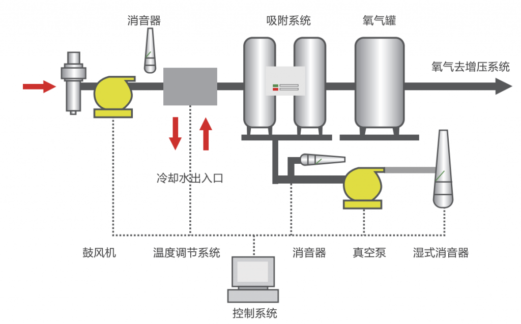 解吸:饱和沸石通过低于吸附压力的减压方式再生(即释放吸附的气体)。这是通过干式真空泵实现的。产生的废气排放到大气中。为了保持氧气供应的连续流动,安装了稳压罐,因此循环继续进行。